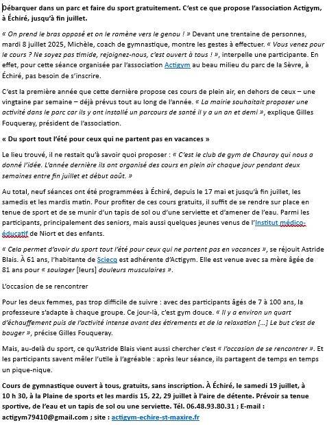 GYM en Plein Air Courrier de l'Ouest et Nouvelle République juillet 2025